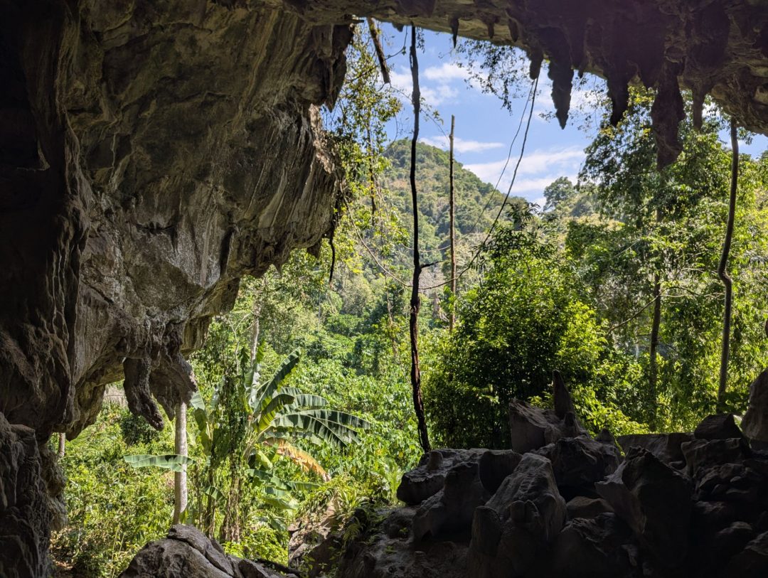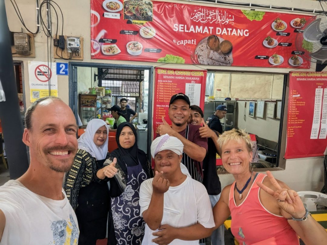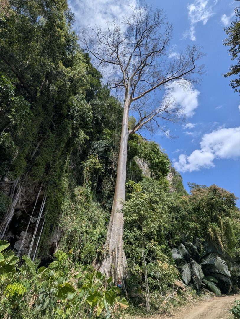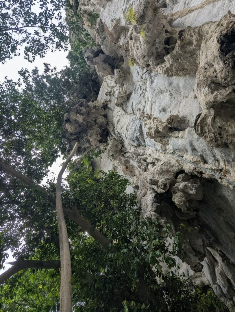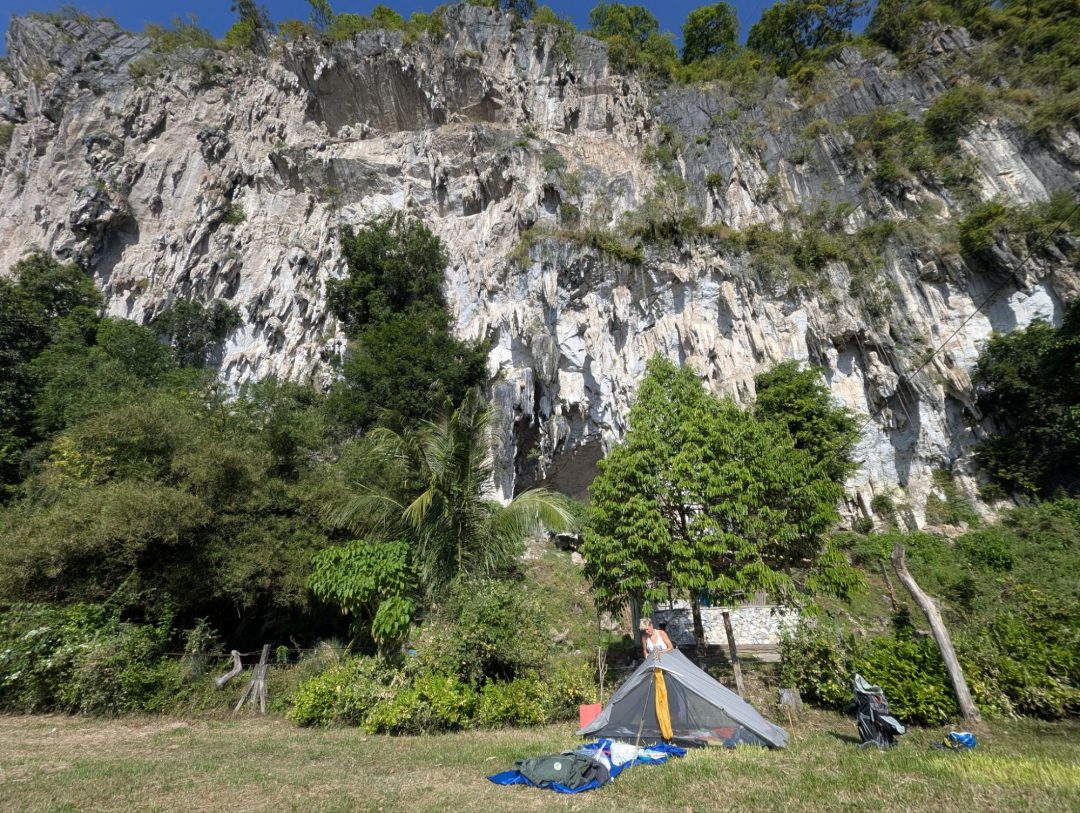 We went to Baling to try the next climbing area called Lubuk Pedati (see it on thecrag.com). After one night at the official camp spot right next to the noisy small road, we moved our tent to the other side of the river, directly in front of the climbing crag. It was a beautiful place and our only neighbor was happy with us camping there.The bridge connecting both sides of the river was broken but the locals already started repairing it. Crossing the river by foot was possible through the waist deep water.The routes were very awesome! Especially the trees growing next to the crag and connecting to the rock looked fantastic. We did a lot of 3D climbing and even encountered a hornet that did bite Racki before we moved it away from the climbing route. The weather was super nice. No rain at all.One day, we did a small hike and visited some of the caves.Beautiful stones.And alien artifacts.And we met this huge tree. Racki is standing beside it to indicate its hugeness.One of the fattest lianes we had met so far.During our time in Baling, I got pretty ill and could not climb for more than a week. So we moved from our tent to a bungalow.And we found the cheapest accommodation for about 11 Euro per night.The protection foil has to stay, of course πThe locals were friendly and interested as always. Here Racki is playing Badminton with local girls π€Every evening we went to one of the cheap authentic restaurants and for some meeting western tourists was quite a highlight. So there were a lot of selfies and Instagram videos. This family was especially super nice. They even invited us to our last dinner before we left Baling again.